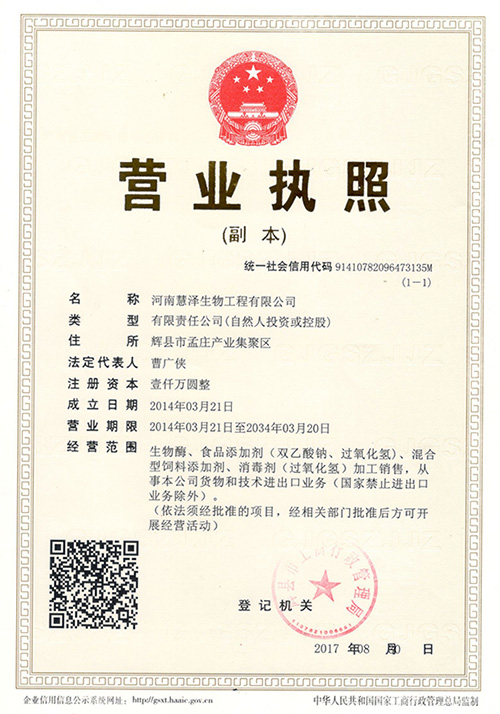 鄭州慧澤生化科技有限公司是一家充滿朝氣的科研生產(chǎn)型高技術(shù)企業(yè)。目前公司業(yè)務(wù)主要集中在精細(xì)化工、食品化工和微生物制劑行業(yè)。公司現(xiàn)已建成鄭州、焦作、新鄉(xiāng)三個生產(chǎn)基地,其中河南新鄉(xiāng)輝縣孟莊生產(chǎn)基地占地70畝,總投資達(dá)1.2億。現(xiàn)擁有年產(chǎn)100000噸過氧化氫消毒劑,年產(chǎn)8000噸的過氧化鈣和年產(chǎn)5000噸的雙乙酸鈉的生產(chǎn)線,同時開設(shè)有生產(chǎn)總量5000噸的枯草芽孢桿菌、地衣芽孢桿菌等微生態(tài)制劑發(fā)酵生產(chǎn)車間。公司始終堅持“以人為本,科技興企,品質(zhì)優(yōu)良,用戶滿意”的經(jīng)營宗旨。為客戶創(chuàng)造價值更多的價值...